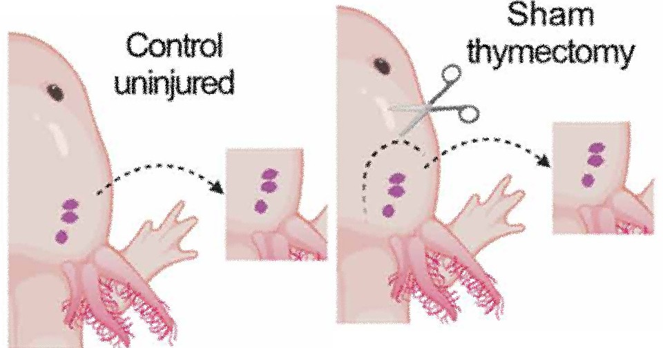 Команда ученых под руководством Анны Чарквиани (Anna Czarkwiani) из Технического университета Дрездена продемонстрировала, что аксолотли могут регенерировать de novo тимус, представленный у них тремя узелками с двух сторон головы. Ученые удаляли эти узелки у молодых аксолотлей в возрасте 6–8 недель либо с одной, либо с обеих сторон, и в течение двух месяцев узелки вновь вырастали. На 60 день новые тимусы морфологически и функционально не отличались от контрольных. Они включали Т- и В-лимфоциты, макрофаги, миелоидные, эндотелиальные и мезенхимальные клетки и клетки эпителия тимуса. Каждая популяция клеток экспрессировала свои маркеры, а размеры каждой популяции были одинаковыми в контрольных и во вновь образованных тимусах.