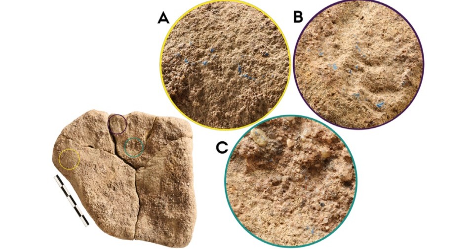 На каменном предмете, возраст которого составляет примерно 13 тысяч лет, исследователи заметили остатки синего пигмента и изучили их с помощью различных методов, включая сканирующую электронную микроскопию и энергодисперсионную рентгеновскую спектроскопию, инфракрасную спектроскопию с преобразованием Фурье и волоконно-оптическую спектроскопию. Проведенные анализы убедительно показали, что пигмент был изготовлен из содержащего медь минерала — азурита, который, по данным ученых, можно было добыть в паре десятков километров от стоянки.