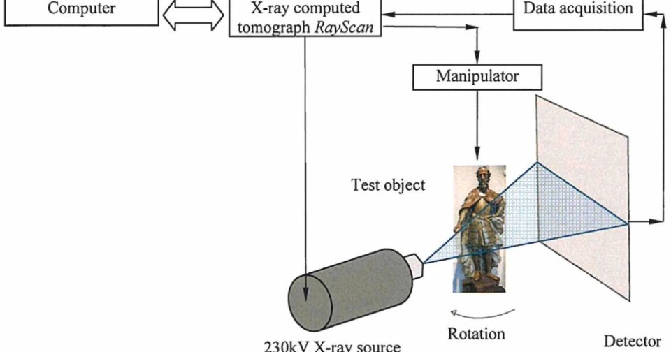 Однако, если объект исследования слишком большой, то его нельзя отсканировать с помощью обычного томографа. В частности, с такой проблемой столкнулись Рутиле Пукене (Rūtilė Pukienė) из Центра исследований природы в Вильнюсе и ее литовские коллеги, которые посвятили статью результатам изучения деревянной статуи святого Людовика — французского короля-крестоносца Людовика IX, правившего в XIII веке. Артефакт представляет собой скульптуру короля высотой 170 сантиметров (без учета постамента), передняя часть которого расписана разноцветными красками и украшена резьбой.