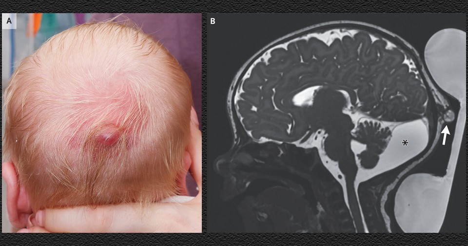 В ирландскую больницу поступил пятинедельный мальчик с болезненным образованием на коже головы, которое присутствовало с рождения. В остальном он был здоров и родился в срок, мать во время беременности принимала фолаты для профилактики аномалий развития нервной системы. При осмотре на затылке определялось плотное не пульсирующее просвечивающее при пропускании света образование диаметром 1,3 сантиметра. Оно было окружено кольцом темных грубых волос, характерных для дефектов нервной трубки. В остальном состояние пациента было без особенностей. На УЗИ визуализировалось подкожное образование смешанной эхогенности, биопсию из опасения дефекта нервной трубки не проводили. Джеймс Ральф (James Ralph) и Фиона Браун (Fiona Browne) из дублинской Больницы Children’s Health Ireland на Темпл-стрит описали этот случай в The New England Journal of Medicine.