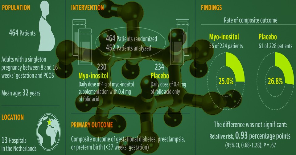 Мио-инозитол в качестве пищевой добавки применяют при синдроме поликистозных яичников, поскольку он восстанавливает инсулиночувствительность, улучшает метаболические показатели и повышает вероятность естественного зачатия. Бас ван Рейн (Bas van Rijn) из Эйндховенского технологического университета с коллегами провел клинические испытания и выяснил, что на частоту основных осложнений беременности при этом заболевании его назначение не влияет. В мультицентровых двойных слепых рандомизированных контролируемых испытаниях приняли участие 464 женщины (средний возраст 31,5 года) с синдромом поликистозных яичников на 8–16 неделе беременности. С этого срока до родов 230 из них получали два грамма мио-инозитола и 0,2 миллиграмма фолиевой кислоты дважды в день, остальные 234 — плацебо и фолиевую кислоту. Результаты исследования опубликованы в JAMA: The Journal of the American Medical Association.