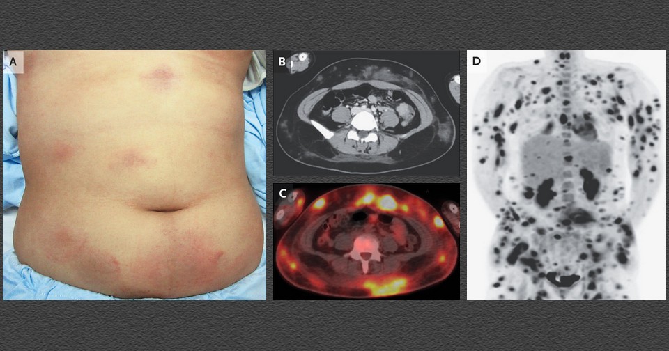 В японскую клинику поступила ранее здоровая 30-летняя женщина с жалобами на болезненные узелки в коже в течение 10 недель, а также лихорадку и ночную потливость в течение шести недель. Биопсия узелка тремя неделями ранее выявила панникулит — воспаление подкожной жировой клетчатки, иногда вовлекающее опорно-двигательный аппарат и внутренние органы. При осмотре определялись болезненные подкожные узелки с покраснением кожи над ними на туловище и конечностях. На КТ живота были видны многочисленные уплотнения в подкожной жировой клетчатке и увеличение селезенки без лимфоаденопатии. ПЭТ/КТ всего тела выявила накопление метки в подкожных узлах. Врачи Синри Окада (Shinri Okada) и Масаси Нисикубо (Masashi Nishikubo) из Городского медцентра Кобе описали этот случай в The New England Journal of Medicine.