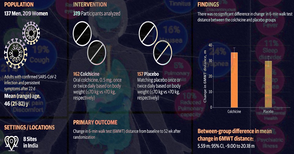 Абхинав Басси (Abhinav Bassi) из индийского подразделения Института Джорджа с коллегами провел клинические испытания и выяснил, что противовоспалительный препарат колхицин не улучшает состояние пациентов с долгим ковидом. В двойных слепых рандомизированных контролируемых испытаниях приняли участие 346 взрослых пациентов (средний возраст 46 лет; 60,4 процента — женщины) с клинически подтвержденным долгим ковидом и функциональными ограничениями в восьми индийских больницах. Половине из них назначили 0,5 миллиграмма колхицина один (при массе тела 70 и менее килограмм) или два (более 70 килограмм) раза в день или плацебо в течение 26 недель. Эффекты оценивали через 12, 26 и 52 недели. Результаты опубликованы в журнале JAMA Internal Medicine.
