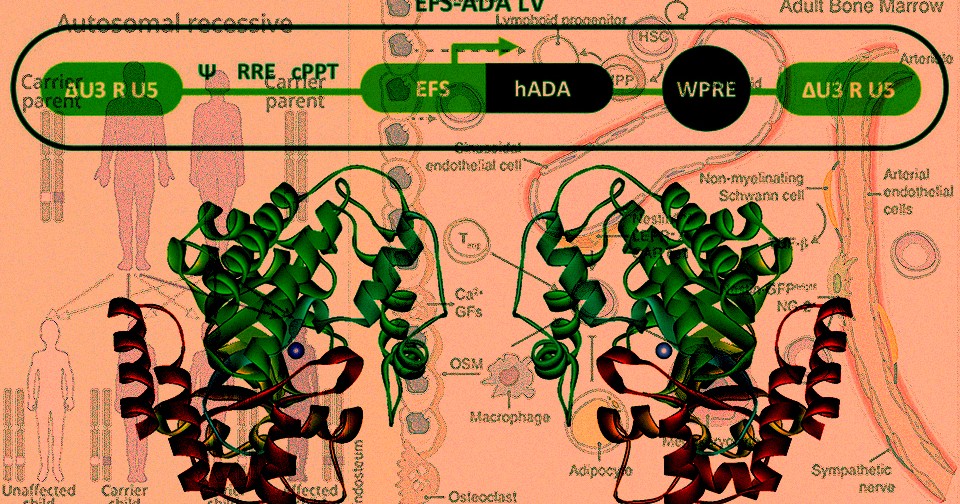 Имеющиеся виды лечения включают заместительную терапию пегилированной аденозиндезаминазой, которая производит лишь частичный эффект, и трансплантацию донорских кроветворных стволовых клеток — а она чревата серьезными осложнениями, в первую очередь реакцией «трансплантат против хозяина». Чтобы избежать этих осложнений, разработана генная терапия ex vivo, при которой у пациента забирают кроветворные стволовые CD34+ клетки, с помощью вирусного вектора снабжают их геном рабочей версии аденозиндезаминазы и возвращают в организм. Ранние версии терапии с использованием гамма-ретровирусного вектора могли приводить к инсерционному онкогенезу, и международная научная группа разработала препарат на основе самоинактивирующегося лентивирусного вектора EFS-ADA LV. В рамках пилотных клинических испытаний его ввели нескольким десяткам детей с тяжелым комбинированным иммунодефицитом.