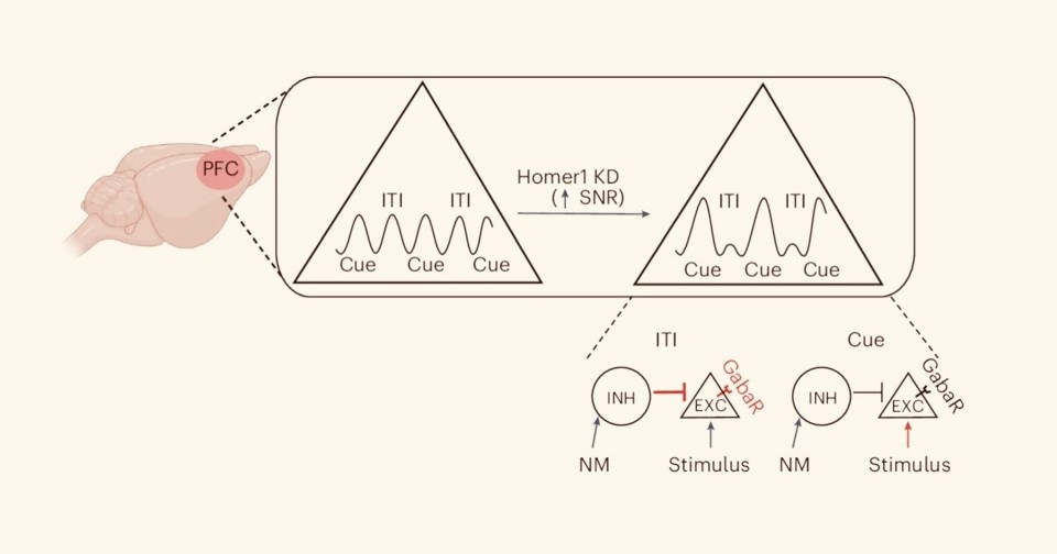 Секвенирование РНК отдельных клеток ПФК мышей двух линий с разными гаплотипами показало, что в отдельных кластерах глутаматергических нейронов мышей Homer1 экспрессировался по-разному. У мышей, у которых экспрессия Homer1 была снижена, активнее экспрессировались несколько генов рецепторов ГАМК и была снижена экспрессия генов глутаматергических рецепторов. Эти нейроны быстрее отзывались на тормозные сигналы, опосредованные ГАМК, и медленнее — на возбуждающие, опосредованные глутаматом. Профили экспрессии вышестоящих нейронов, выделяющих ГАМК, тоже различались. В итоге тормозной тонус ПФК усиливался, однако ее активность не просто подавлялась, а быстрее адаптировалась к ситуации: повышалась, когда возникал сигнал, и быстро снижалась после него. У мышей с высоким уровнем Homer1 все время теста на внимание активность ПФК была повышена.